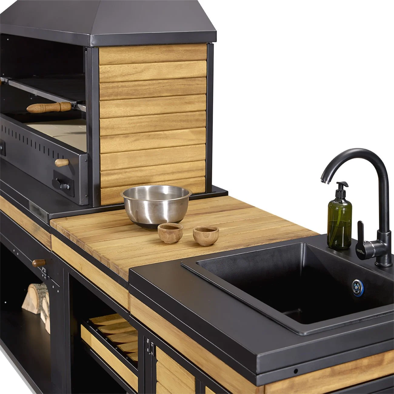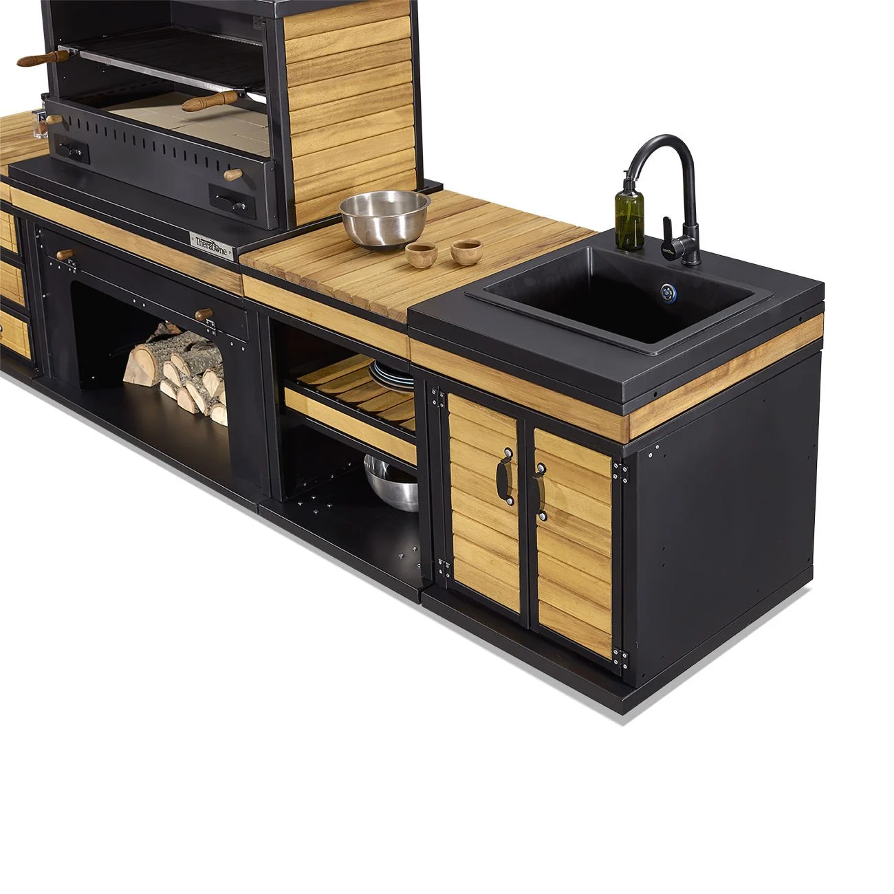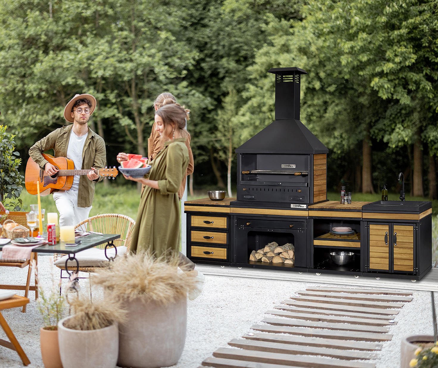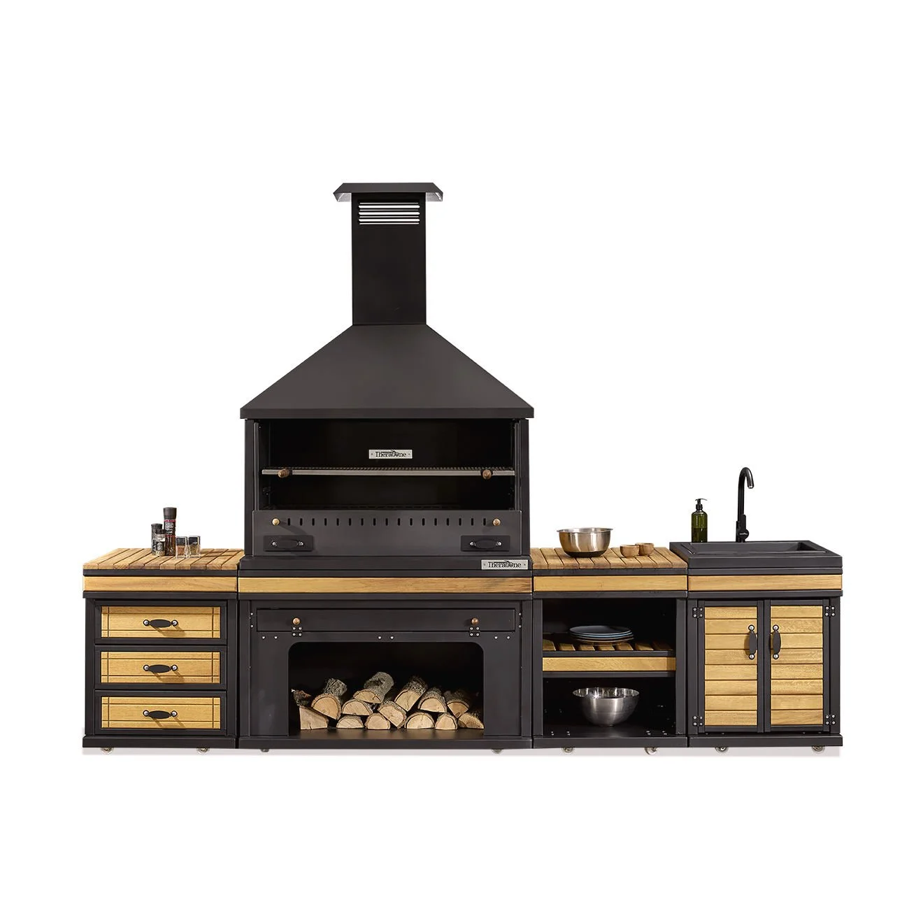 Mangal tutkunlarının gözde parçası… Odun ateşinde nar gibi pişen lezzetlerin, samimi sohbetlerle buluşma noktası. Baharda geldiğine göre, hem vücudunuza güneşten bol bol D vitamini toplayabilir hem de muhteşem lezzetler eşliğinde bahçenizin keyfini çıkarabilirsiniz.Sipariş verilen ürünleriniz en geç 15 gün içerisinde özenle hazırlanır ve sevki gerçekleştirilir.Sorularınız ve önerileriniz için 0 850 399 22 88 numaralı telefonumuzdan bizlere ulaşabilirsiniz.-Ürün içeriği;çekmece modülü, anka barbekü, açık raf modülü ve lavabo modülü ile beraber 4 modüldenoluşmuştur,-Sayfanın alt bölümünde ki ürünün teknik çizim bölümünden tüm detay ölçülerine ulaşabilirsiniz,-Ürünümüz farklı kalınlıklardaki metal saclardan imal edilmiştir,-Ürünümüzün içerisinde 60 cm uzunluğunda 1 adet bacası beraberinde gelmektedir,-Ürünün odunluk bölümünde ızgaralarınızı saklayabileceğiniz kapaklı bir bölmesi mevcuttur,-Yanma bölümü ve iç hazneye ısıya dayanıklı yanmaz boya, dış bölüme ortam şartlarına dayanıklı boya uygulanmıştır,-İç haznenin tümüne özel ısı yalıtım malzemesi uygulanmıştır,-İç haznede ızgaranın yüksekliği 3 kademeli ızgara rafı bulunmaktadır,-İç haznenin tabanı ısıyı uzun süre koruyabilmek için ateş tuğlası ile örülmüştür,-Ürünümüzün içerisinde 1 adet standart çelik ızgarası hediye gelmektedir,-Estetik ve dayanım açısından yan kısımlarda ve tezgah üzerinde dış ortamlara dayanıklı iroko ağacı kullanılmıştır,-Bahçenizin, terasınızın istediğiniz yerinde kullanılabilmesi amacı ile tekerlekli olarak tasarlanmış olup güvenlik açısından stoplu tekerlek kullanılmıştır. Tekerleklerin yanında ayrıca yükseklik ayarlı ayakları mevcuttur.Ürün Opsiyonları-Kullanım alanınıza uygun olarak baca uzunluğunu ürün sayfasının alt kısmında bulunan aksesuarlar bölümünden tercih edebilirsiniz.-Izgara seçeneklerimiz arasından kullanımınıza en uygun olanı ürün sayfasının alt kısmında bulunan aksesuarlar bölümünden tercih edebilirsiniz.-Ürünümüzü ağır kış şartlarından korumak ve kullanım ömrünü uzatabilmek adına özel olarak üretilmiş brandasını ürün sayfasının alt kısmında bulunan aksesuarlar bölümünden tercih edebilirsiniz.Kullanım Tavsiyeleri-Barbekü ve modülleri teknik çizimde de belirtildiği gibi yan yana konulup birleştirme noktalarından beraberinde gönderilen bağlantı parçaları ( civata, somun) ile bileştirilmelidir.-Barbekünüzün yakma işlemi sırasında yanma haznesinin haddinden fazla doldurulmaması, ateşin ızgara alanının orta kısmında yakılması ısının doğru yayılması ve pişirme performansını arttıracağından tavsiye edilmektedir.-Izgara bölümü ham çelikten imal edildiği için kullanım öncesi ve sonrası yüzey temizliğinin su ile değil yağ veya soğan ile yapılması tavsiye edilir.-Barbekünüzün ahşap bölümleri iroko ağacından imal edildiğinden yılda 2 kez yağlanması kullanım ömrünü uzatacağından tavsiye edilir.Garanti Koşulları-Garanti süresi, teslim tarihi ile 1(bir) yıl olup, bu süre zarfında kullanım koşullarına uygun hallerde ilgili malzeme ve teknik destek ücretsiz olarak müşteriye sağlanacaktır.-Kullanım tavsiyeleri dışında kullanımda oluşan arıza durumlarından firmamız sorumlu değildir.